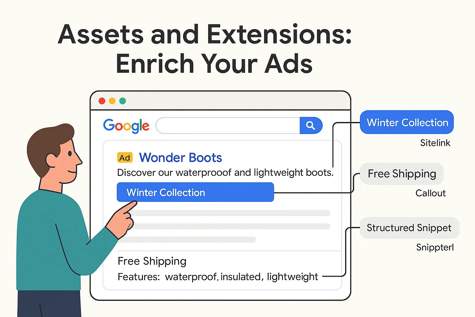 Immagina di non dover più litigare con un unico testo di annuncio fisso, ma di poter creare decine di varianti partendo da un set di titoli e descrizioni: è esattamente quello che fanno le Responsive Search Ads. Tu carichi fino a 15 headline e 4 descrizioni, ognuna focalizzata su un messaggio diverso (ad esempio "Spedizione gratuita", "Garanzia 2 anni", "Wonder Boots con pannello solare"), e Google combina in automatico le versioni che ritiene più adatte a ogni singola asta. Dietro le quinte, un algoritmo testa migliaia di combinazioni per capire quali accoppiano meglio le parole chiave dell'utente e il contesto (device, località, momento della giornata). Il vero punto di forza di questa tecnologia è duplice. Da un lato, hai flessibilità: invece di gestire manualmente decine di annunci diversi, concentri tutti i tuoi messaggi in un unico gruppo e lasci che l'algoritmo "impari" quali titoli e descrizioni funzionano meglio insieme. Dall'altro, c'è la rilevanza: ogni utente vede la combinazione di testo che matcha più da vicino la sua ricerca, aumentando la probabilità di clic—and, di conseguenza, di conversione. Un altro vantaggio, spesso sottovalutato, è il test A/B implicito: non devi creare due annunci e attivarli in parallelo, perché Google valuta continuamente le performance di ogni possibile accoppiamento e favorisce progressivamente le varianti più performanti. In questo modo, la creatività si ottimizza da sola, giorno dopo giorno, senza la necessità di interventi manuali continui. Esempio pratico Se vendi Wonder Boots, potresti inserire titoli come "Stivali da escursione high‑tech", "Wonder Boots impermeabili" e "Prova i nostri stivali solari", affiancandoli a descrizioni che spingono su "Durata fino a 48 h" o "Design ultraleggero". Nel giro di pochi giorni Google capirà che le combinazioni che menzionano "impermeabili" + "ultraleggero" generano più acquisti e inizierà a mostrarle più spesso. In sintesi, le Responsive Search Ads trasformano la gestione creativa degli annunci in un processo dinamico e guidato dai dati, liberandoti dal compito di sperimentare manualmente ogni possibile variante e consentendoti di concentrare il tuo tempo su strategia e ottimizzazione avanzata.Asset ed estensioni: arricchire i tuoi annunci