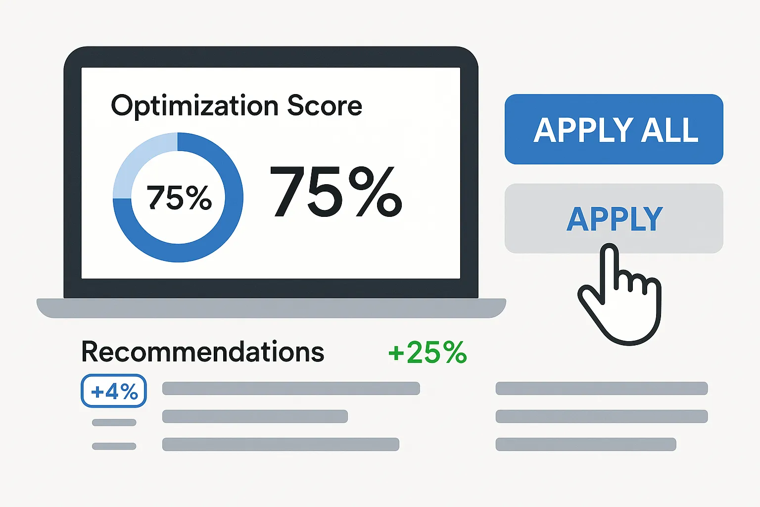 L'Optimization Score è un indicatore numerico (da 0 a 100 %) che Google Ads calcola per dirti quanto la tua campagna si avvicina alle best practice raccomandate. In pratica, più il punteggio è basso, più opportunità di miglioramento hai a disposizione. Se vedi un 75 %, ad esempio, significa che seguendo tutte le proposte potresti spingere ulteriormente i risultati del 25 % circa, ottimizzando budget, offerte, creatività e targeting. Quando entri nella sezione Raccomandazioni, ogni suggerimento è accompagnato da un'etichetta "+ X %" che stima l'incremento potenziale del tuo punteggio applicandolo. Così capisci subito quali interventi portano il maggior beneficio: dall'attivazione dello Smart Bidding, all'aggiunta di nuove estensioni, fino alla rotazione di annunci più performanti.