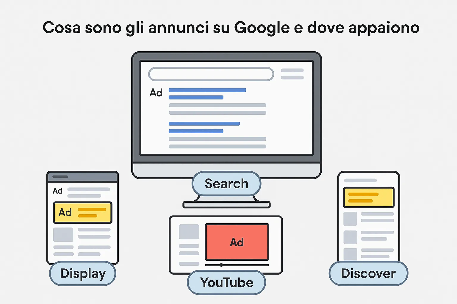 Con questo mix, hai la possibilità di coprire tutte le fasi del customer journey: dall'esigenza latente (Discover), alla fase di considerazione (Display), fino al click con intento preciso (Search) e all'engagement video su YouTube. Proprio questo approccio multicanale, basato su dati in tempo reale e ottimizzazioni continue, rende Google Ads uno strumento indispensabile per chi vuole far crescere rapidamente la propria visibilità online.