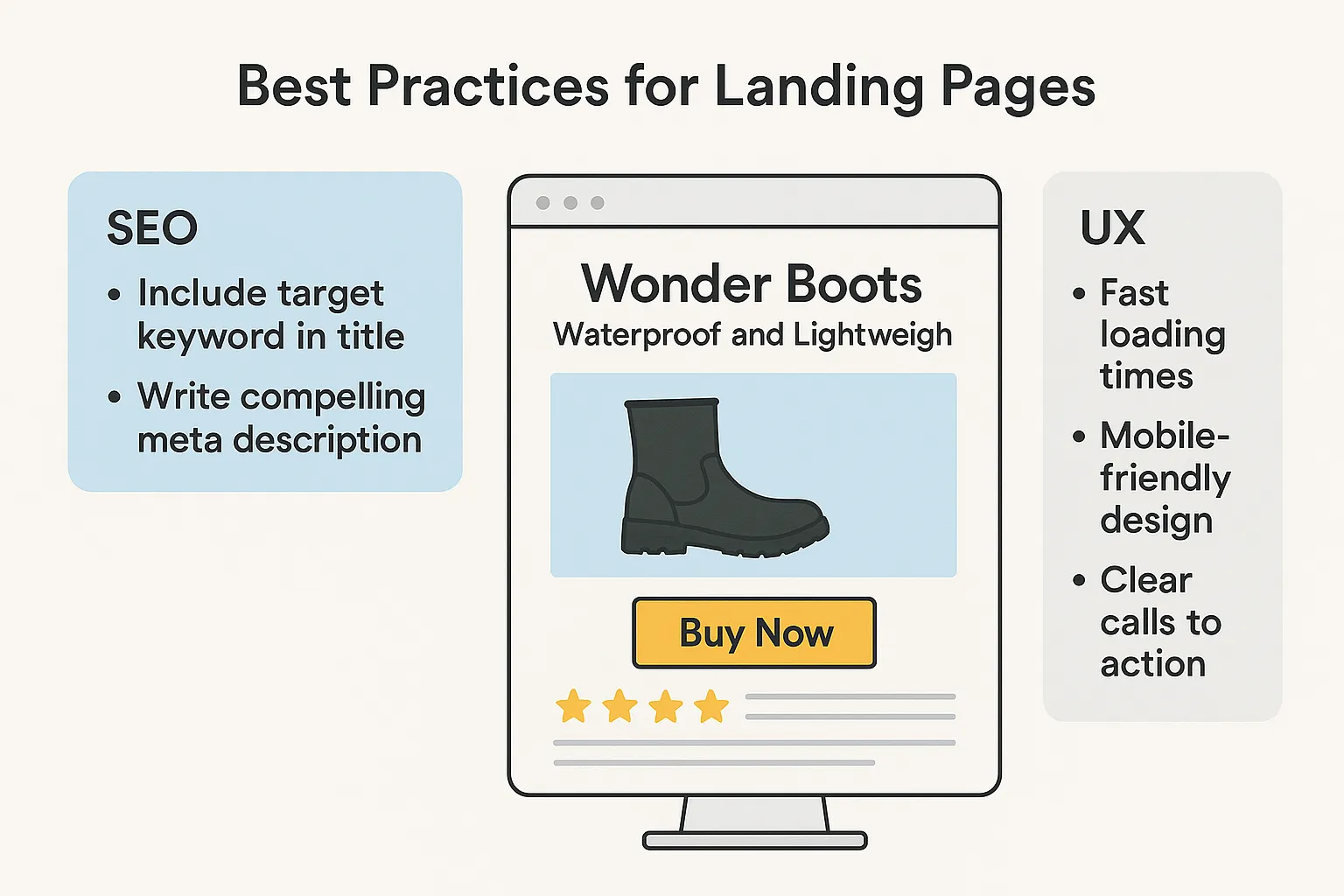 Immagina di aver creato un annuncio per chi cerca "Wonder Boots impermeabili prezzi". Il tuo Responsive Search Ad potrebbe avere un titolo "Wonder Boots 2025: Impermeabili e Leggeri" e una descrizione "Prodotti con tecnologia solare, consegna in 24 h". Quando l'utente clicca, la landing page apre con lo stesso titolo ("Wonder Boots 2025: Impermeabili e Leggeri"), seguito da un sottotitolo che riprende il messaggio dell'annuncio ("Scopri il comfort high‑tech con pannello solare integrato") e da una CTA ben evidente ("Acquista ora da 99 €"). L'immagine in alto mostra lo stivale sotto la pioggia, mentre una breve lista sotto evidenzia i tre plus tecnici: impermeabilità garantita, durata batteria solare 48 h e suola antiscivolo. In questo modo l'utente percepisce coerenza tra ricerca, annuncio e pagina: il match tra il termine digitato, il testo promozionale e il contenuto visivo e testuale elimina qualsiasi barriera cognitiva e spinge all'azione. Avere un percorso coerente e lineare non solo migliora la Quality Score (perché l'utente trova subito quello che cerca), ma aumenta le probabilità di conversione, perché ogni elemento parla la stessa lingua.Conclusioni e prossimi passi