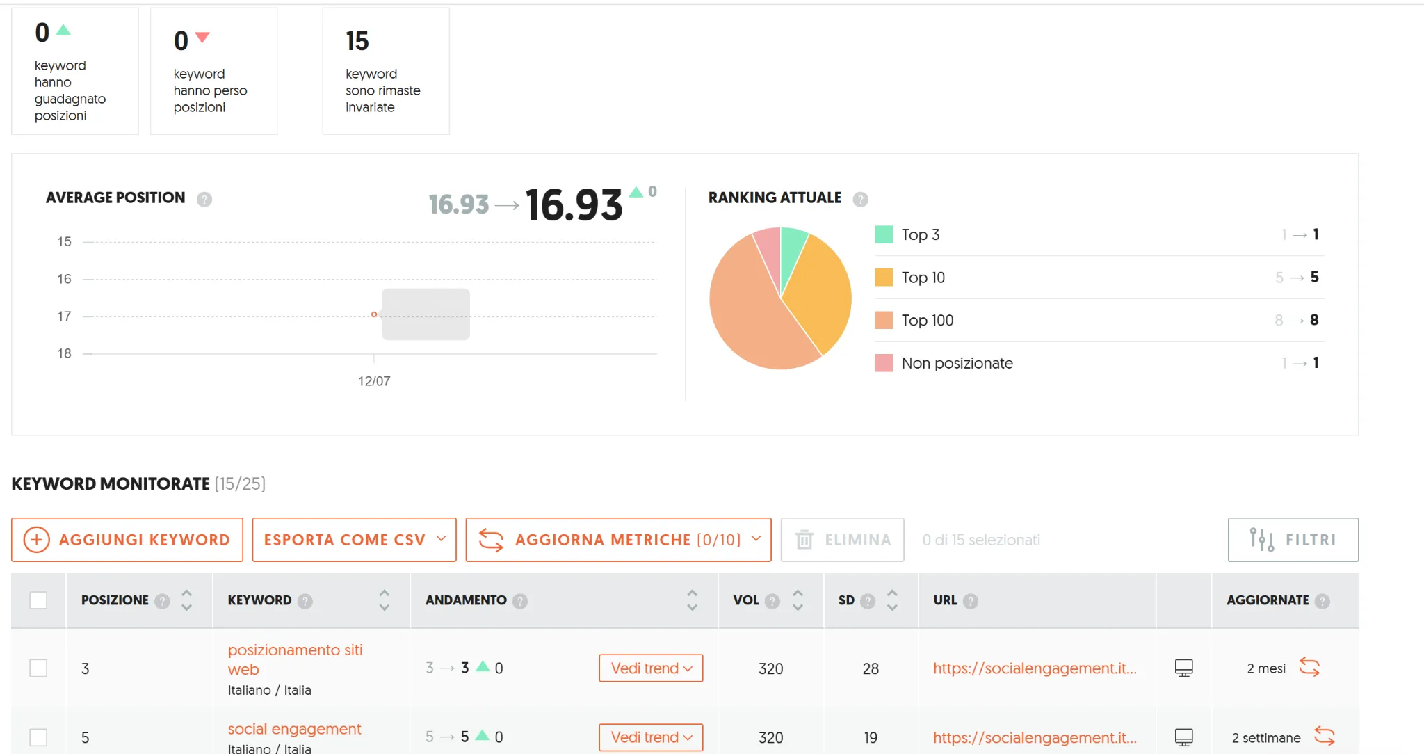 Questa funzione consente di tenere traccia delle posizioni delle parole chiave del tuo sito nei risultati di ricerca nel tempo. Puoi monitorare le variazioni quotidiane sia su dispositivi desktop che mobili, e analizzare l'andamento storico per valutare l'efficacia delle tue strategie SEO.